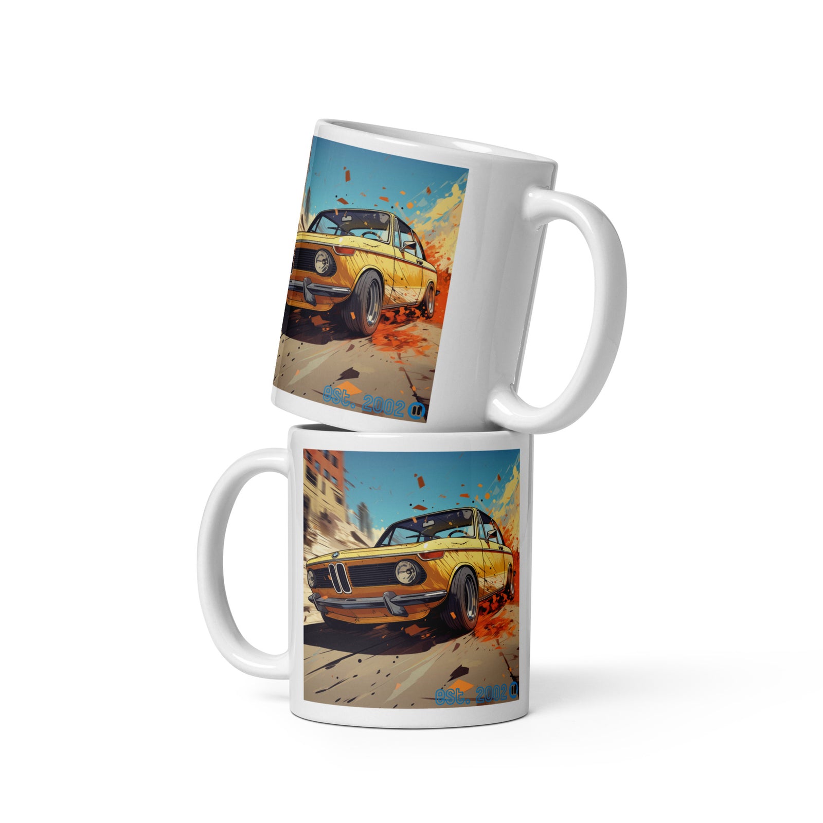 BMW 2002 Racing Through the Streets White Glossy Mug