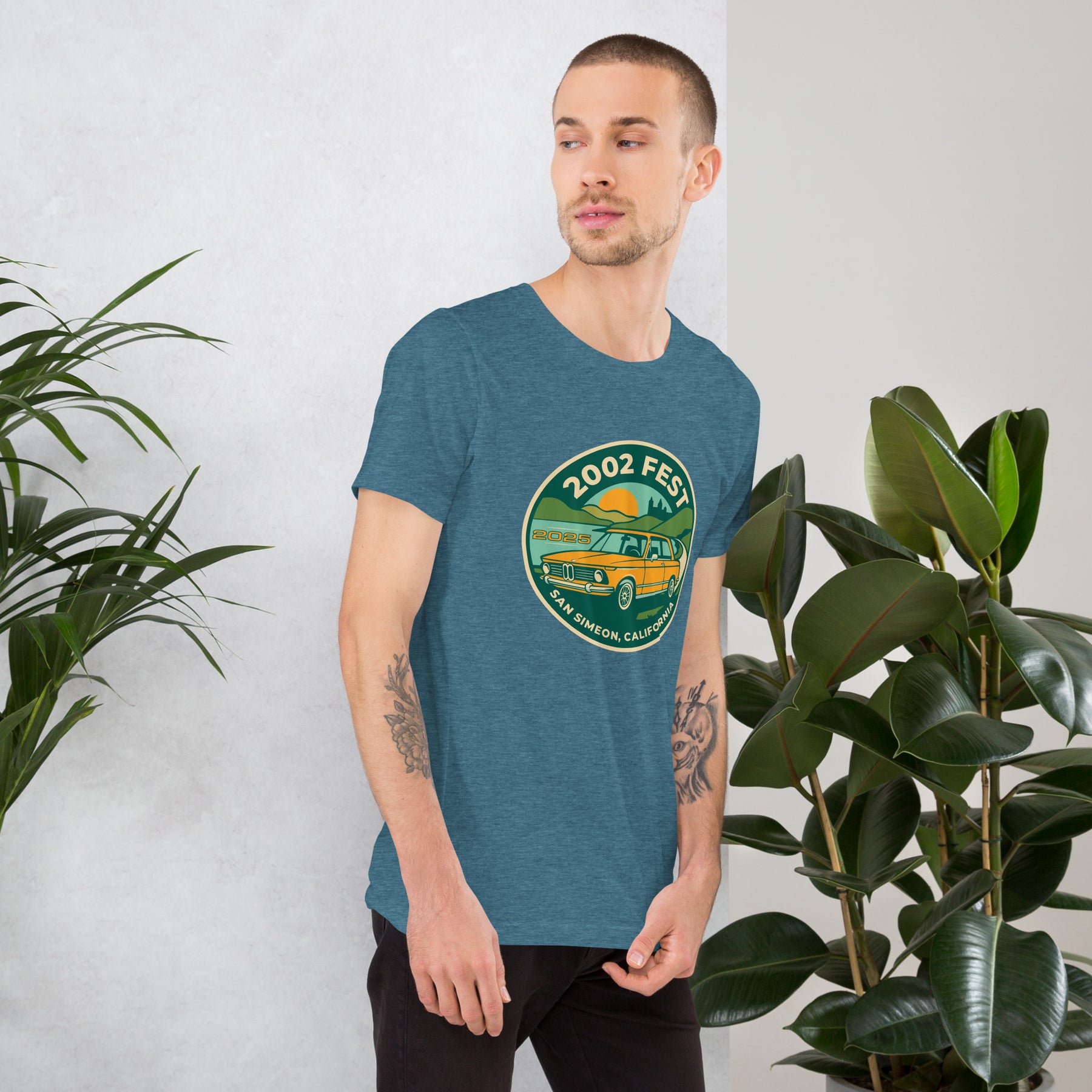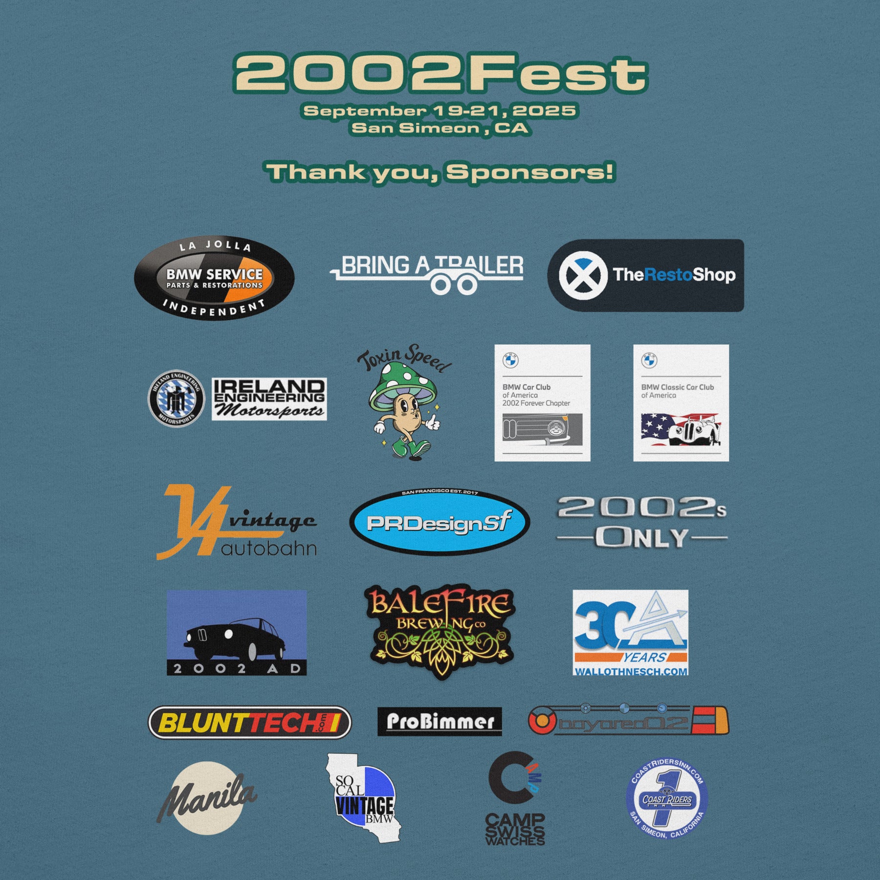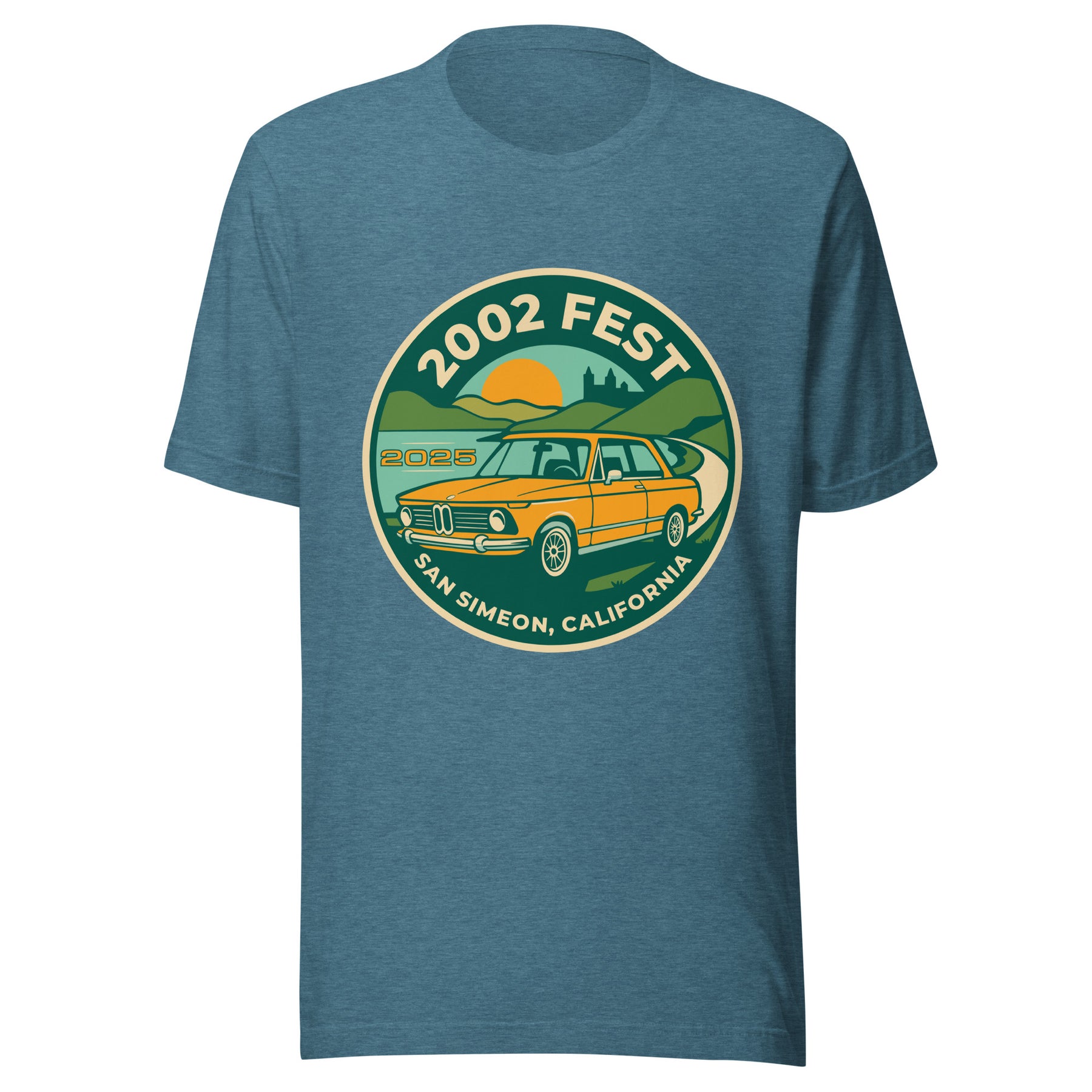 Celebrate the spirit of vintage BMW culture with the official 2002Fest T-shirt! Featuring a retro-style logo with the iconic BMW 2002 set against the scenic coastal backdrop of San Simeon, California, this shirt is the perfect souvenir from the ultimate classic car gathering.