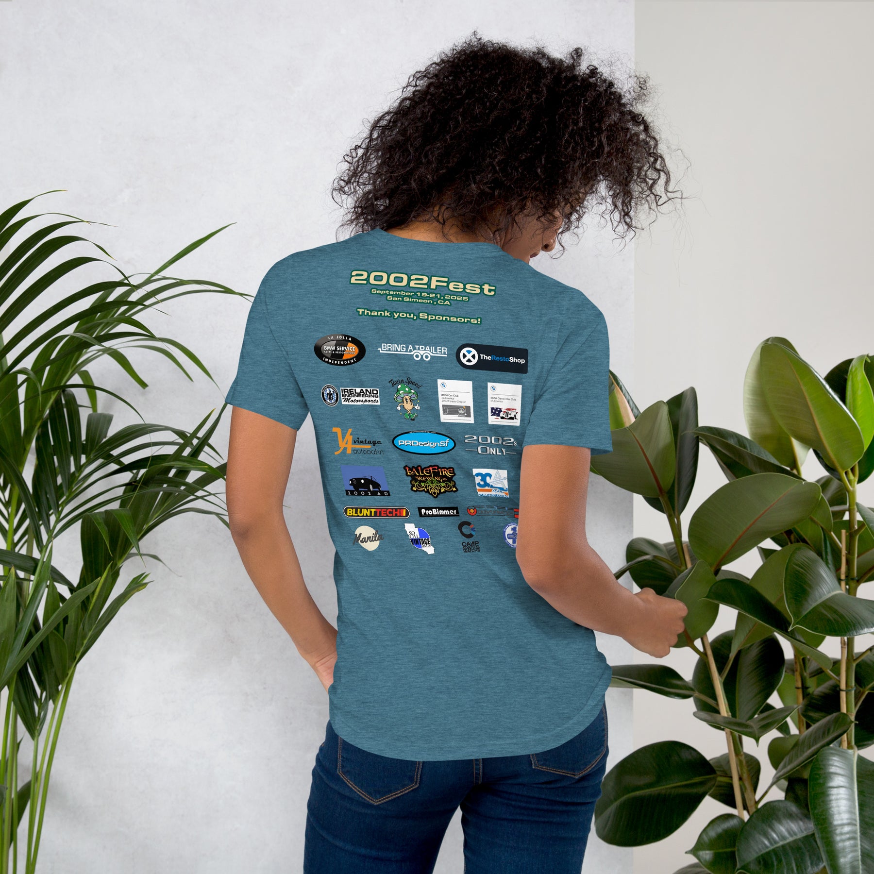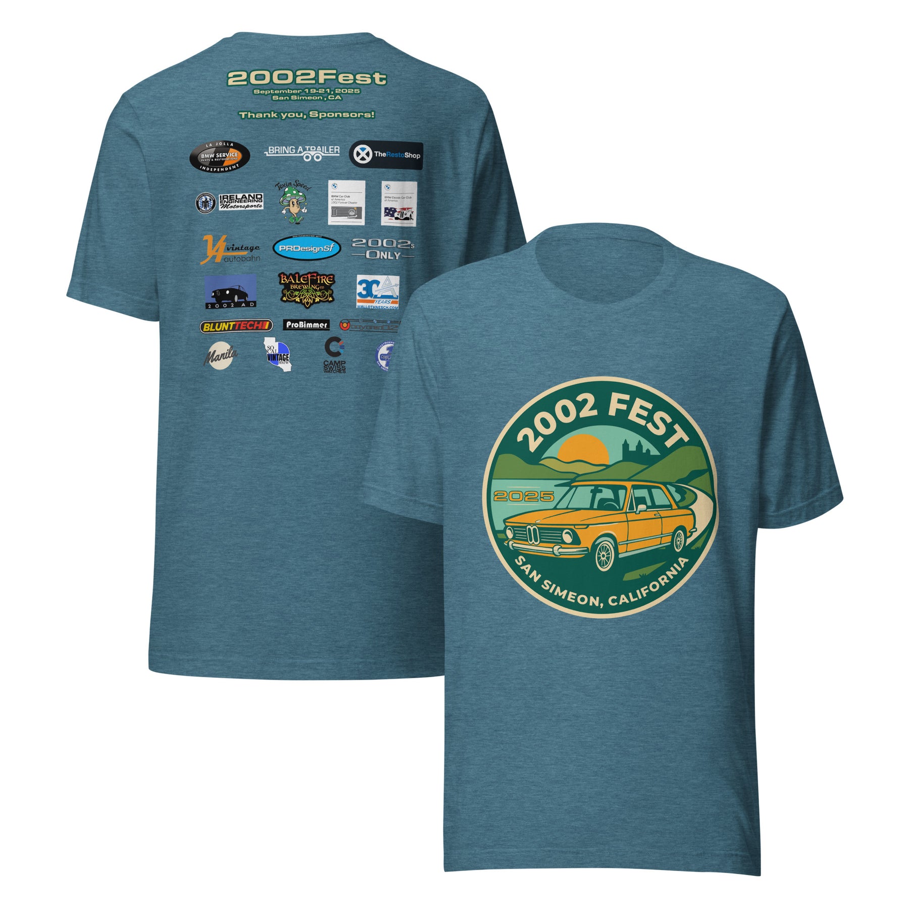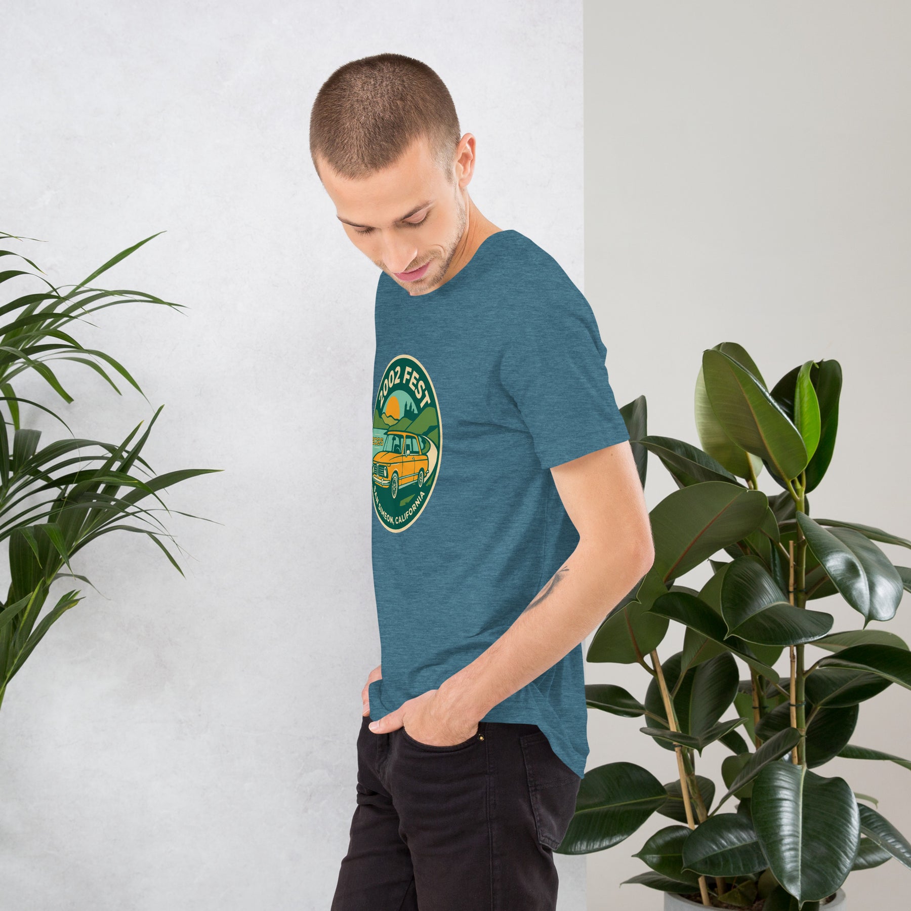Celebrate the spirit of vintage BMW culture with the official 2002Fest T-shirt! Featuring a retro-style logo with the iconic BMW 2002 set against the scenic coastal backdrop of San Simeon, California, this shirt is the perfect souvenir from the ultimate classic car gathering.