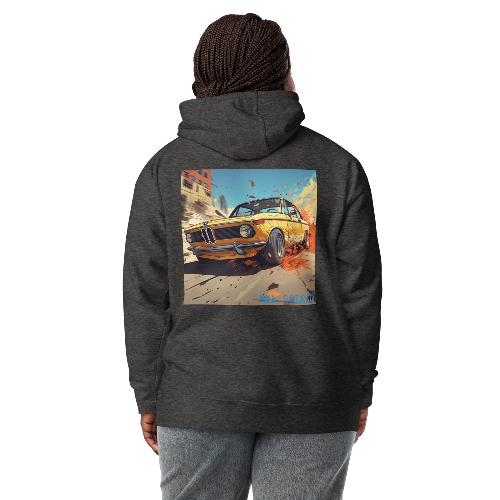 Introducing our BMW 2002 Racing Through the Streets Hoodie. A perfect blend of comfort and style, designed exclusively for vintage car enthusiasts.